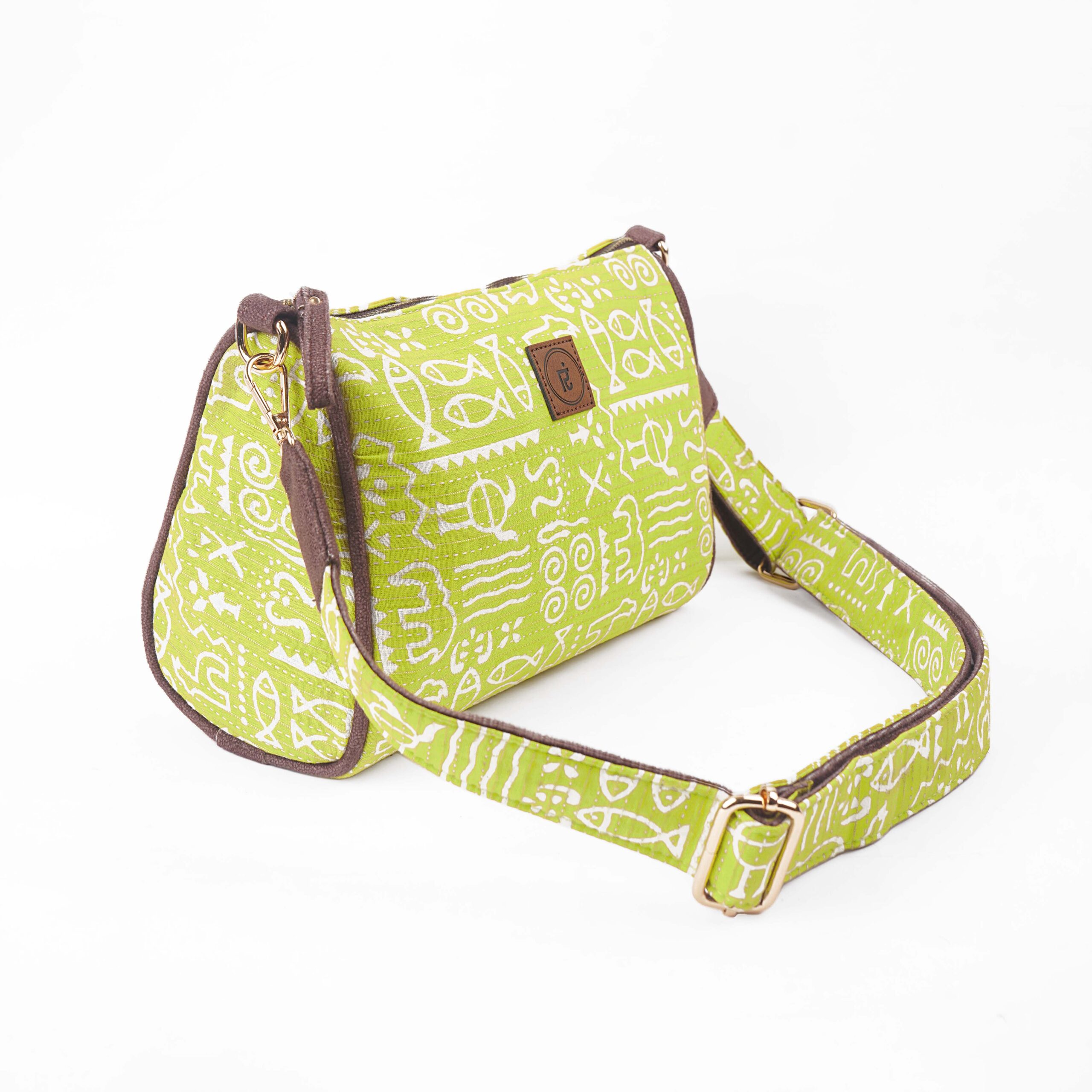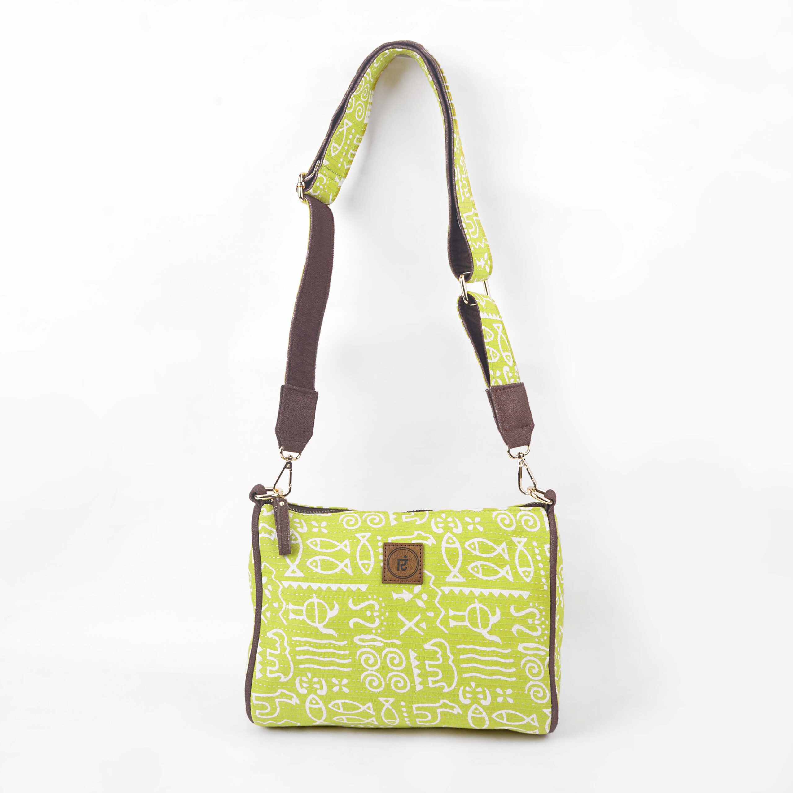 Description: Drum sling is a stylish, one strap bag. It is a durable, lightweight drum sling designed from Kantha fabric with a zipper pocket along with a cross-body non adjustable detachable belt. Drum sling is a compact conventional bag with metallic zip to secure all essentials. The drum sling has one zipper main pocket, inside one small zipper pocket providing space for keeping small accessories. The drum sling has a well stitched inner lining and high quality accessories for easy accessibility and storage.