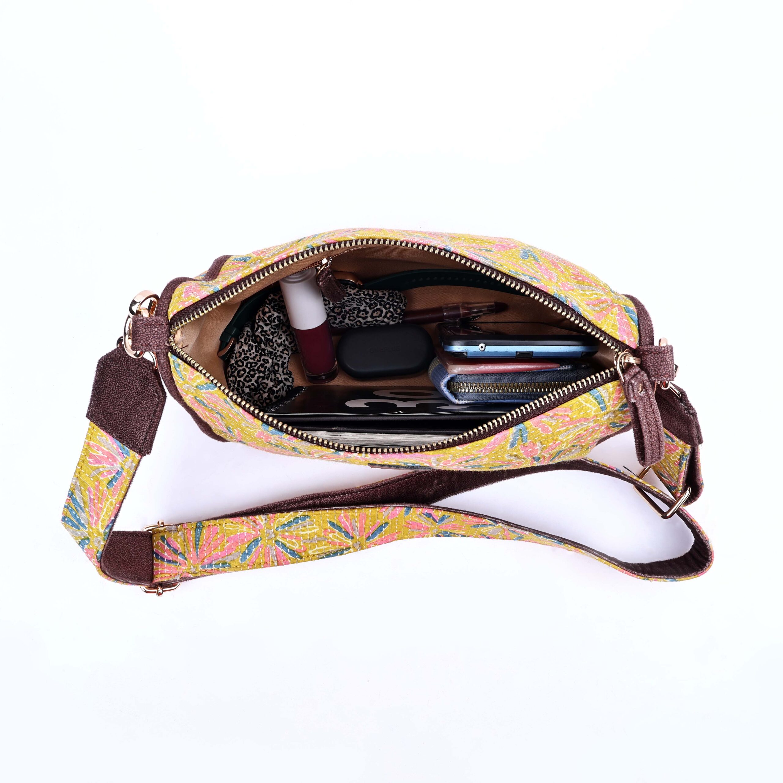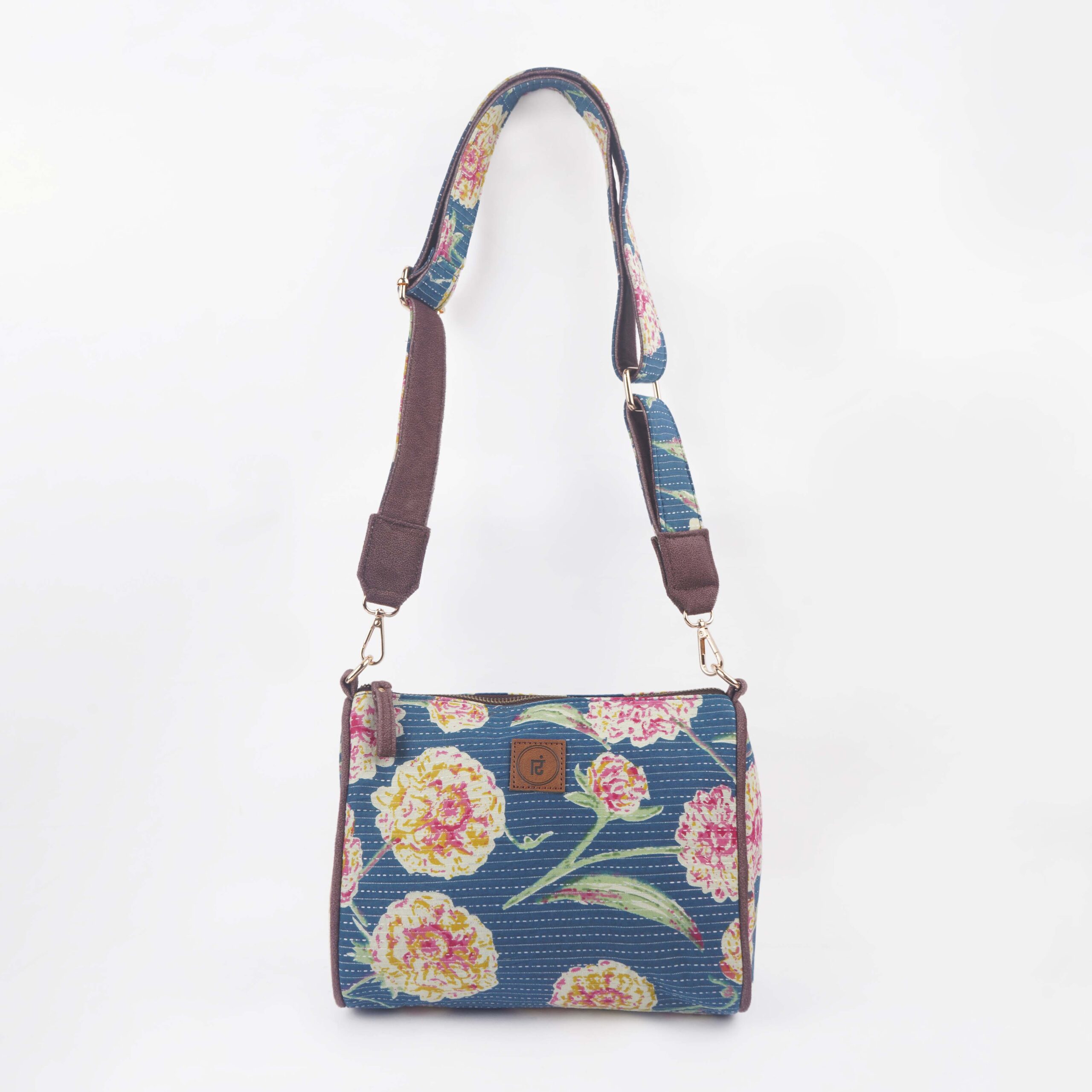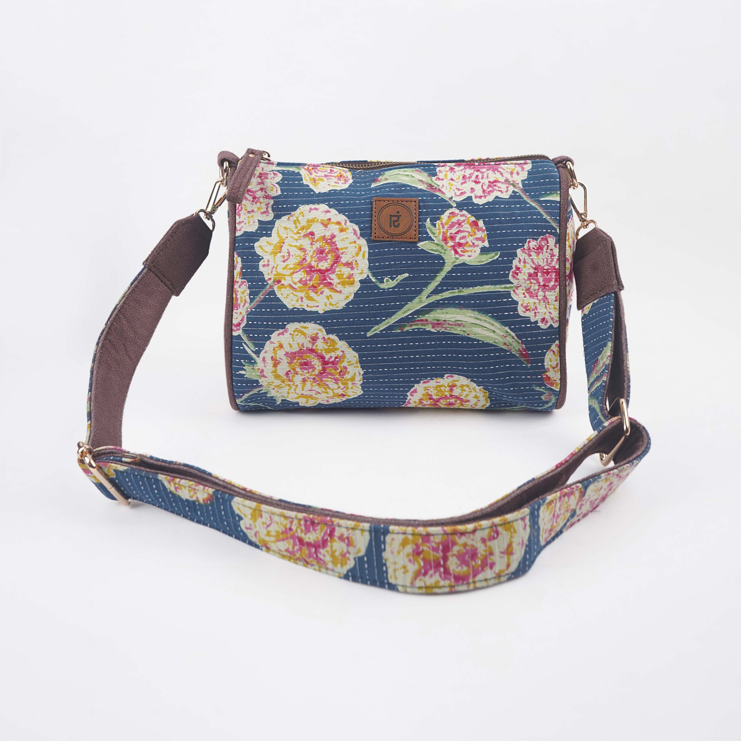 Description: Drum sling is a stylish, one strap bag. It is a durable, lightweight drum sling designed from Kantha fabric with a zipper pocket along with a cross-body non adjustable detachable belt. Drum sling is a compact conventional bag with metallic zip to secure all essentials. The drum sling has one zipper main pocket, inside one small zipper pocket providing space for keeping small accessories. The drum sling has a well stitched inner lining and high quality accessories for easy accessibility and storage.