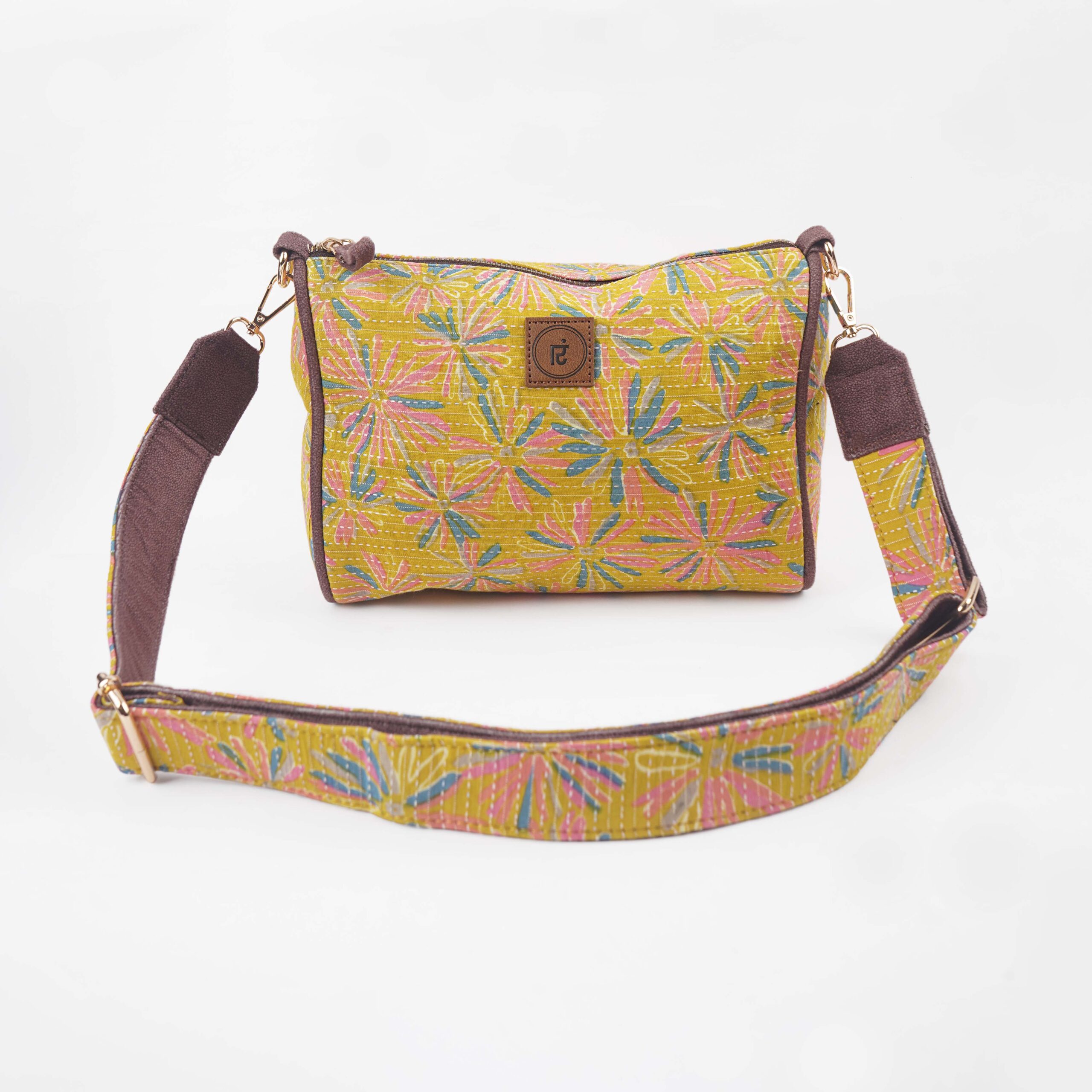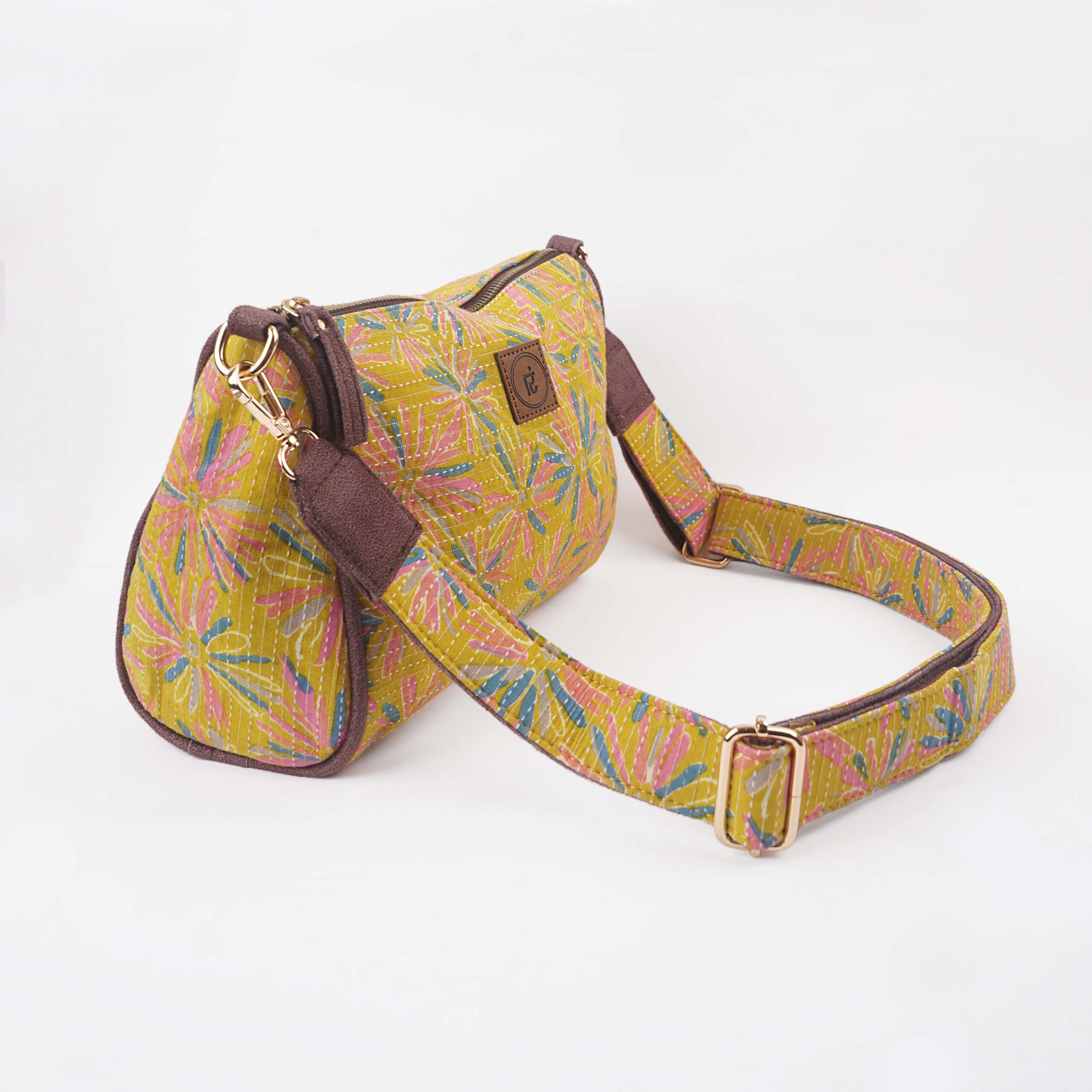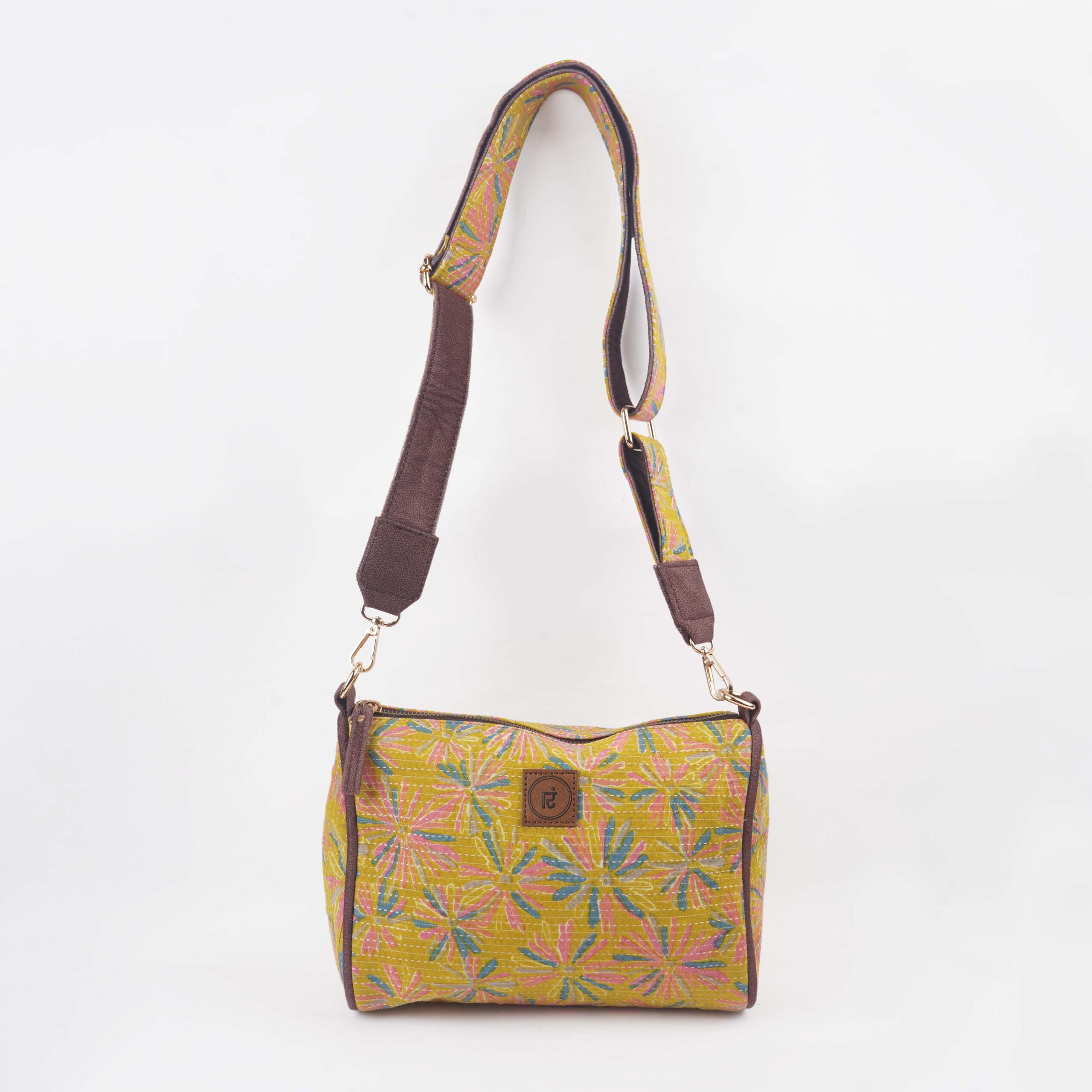 Description: Drum sling is a stylish, one strap bag. It is a durable, lightweight drum sling designed from Kantha fabric with a zipper pocket along with a cross-body non adjustable detachable belt. Drum sling is a compact conventional bag with metallic zip to secure all essentials. The drum sling has one zipper main pocket, inside one small zipper pocket providing space for keeping small accessories. The drum sling has a well stitched inner lining and high quality accessories for easy accessibility and storage.